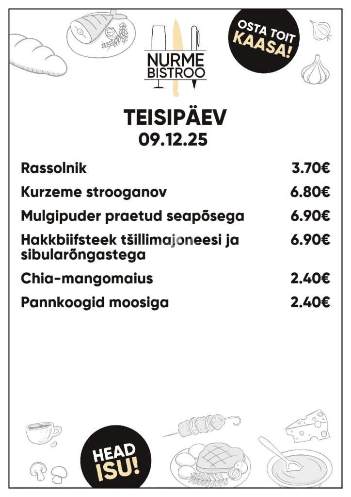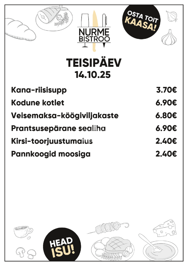 Alustame hommikut kell 8 Hommikusöök Hommikupuder €2,00 Moosi või võiga Muna-peekoni võileib €2.20 Koorikleib, praetud muna, peekon, tomat, kurk, majonees Pannkoogid moosiga €2,40 Suupisted ja maiustused Muna-peekoni võileib €2,20